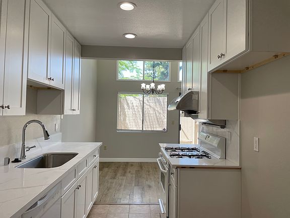 **Charming one level end unit townhome with desirable floor plan offers 2 bedrooms, 1 full bathroom plus 1/4 bath in primary bedroom *spacious living room opens to dining area and kitchen *gourmet fully upgraded kitchen including white cabinets, quartz countertops, sink, Kohler faucet and vent *dinning room with sliding door leading to private side yard *recessed lights and stunning laminate flooring with baseboards throughout the unit *bright and neutral color interior paint *primary bedroom and junior bedroom offer good size closets with organizers *washer and dryer in the unit *more storage space in hallway *one-car detached garage *additional parking space available in community as well *water and trash utility bills covered *homeowner association amenities including pool, spa, and plenty of green *easy access to freeway, shopping, and dinning *Text Francine for details** Water, trash and public area maintenance included, one car garage and one parking space with parking permit. Community amenity including pool, spa and green belt.