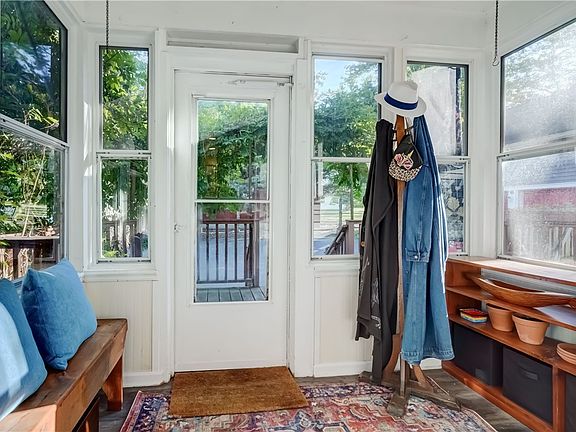 Rarely available classic 1918 built restored home with white oak stained woodwork & doors throughout which add to its charm. Welcoming enclosed porch at the entrance opens to the updated kitchen with a 36" Viking gas range, Viking dishwasher & stainless refrigerator & granite countertops with an adjoining area for dining or relaxing. First floor powder room. The combination living/dining room features a gas fireplace with oak mantel and surround, custom built-ins in the dining area that opens to another enclosed porch. Upstairs there are two bedrooms and a full bath. One of the bedrooms has been enlarged to make a spacious primary one with built-in bookcases. Another wonderful feature is the finished room on the 3rd floor - feels like you are in the Adirondacks! Ideal for a home office/study/ potential bedroom. It features storage spaces and chandeliers with fans. Outside relax on the deck at the entrance or patio in backyard (hot tub excluded). Fully fenced-in backyard with room for gardens & a shed for more storage. Two car garage with a storage room above. This home is just amazing! Beautifully presented by the current owner.