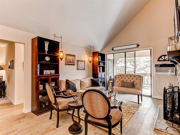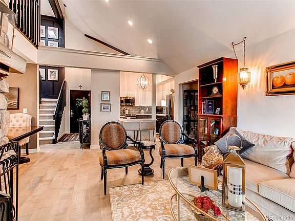 Total Remodel from the walls in! Too many upgrades to list: New sand stained hardwood floors, custom painted solid birch doors throughout, designed kitchen with quartz counters, black stainless Samsung appliances and solid birch soft close shaker cabinets. Bathrooms have custom built vanities, designer tile and solid glass shower enclosures. Living room has a bar area, 18 foot rustic stone wood burning fireplace and oversized sliding glass doors to the covered patio. Painted beamed ceilings and matching railing open to the loft above. Loft is perfect flex space with exposed brick wall and skylight. Loft and bedrooms have new designer carpet. Large laundry room has custom painted cabinets, basket weave tile and a sink. All the walls and ceilings were re-skimmed and scrapped with a high end smooth finish. Custom paint throughout. New high efficiency Dimplex heating system that can be controlled room by room to minimize heating bills. New Friedrich electric cooling system and new Rheem Performance hot water heater. And custom high end lighting throughout. Heated garage parking and additional storage closet in the garage. Walking distance to Cherry Creek State Park and easy access to 225. Unit has a spectacular view of the large private courtyard with beautiful trees and sides next to Carson Park. Just move in and enjoy!