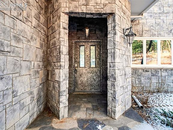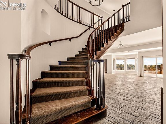 Have you dreamed of living in a castle? Now is your chance to fulfill your dream! This custom 2 story home is built to resemble a castle! Located in Black Forest on a 9.37 ac lot with trees, meadows, and spectacular views of the front range. A detached one car garage is close to the road while the home sits back on the acreage with white fencing bordereing the lot almost completely. The front door is tucked away on the side of the home. Once inside notice stone tile flooring throughout much of the main level. An impressive staircase winds up to the upper level off of the entry. A formal dining room is on the right of the entry and has carpeting inlaid the stone tile floor, and includes a stone tile wall and a built in hutch. The expansive great room has large windows that capture the mountain views and overlook the meadow perfect for horses! A gas fireplace, an elegant 1/2 bathm, and a dining nook with a bay window add to the great room. Step up to the spacious kitchen that has a breakfast bar island, a large island in the center of the kitchen and an abundance of cherry stained cabinets with roll out shelving and marble counter tops. The appliances include a 4 burner down draft range top with a grill/griddle insert, double ovens, a microwave oven, dishwasher, refirgerator, and trash compactor. A room off of the kitchen and adjacent to the dining room has a full wall of cabinets that can act like a walk in pantry and storage for china and table linens. A large office, tucked in behind the kitchen, has spectacular mountian views, and a gas pellet stove. The primary bedroom has carpet, a bay window, a luxurious 5 piece bath ,and a large walk in closet. A partial unfinished walk out basement has a 2nd water heater, and a 2nd laundry hookup Upstairs, there is a small loft with a door to a large composite deck similar to the composite deck off the great room. A 2nd primary suite, a two additional large bedrooms with walk in closets, and a full bath complete this level.