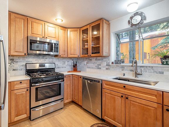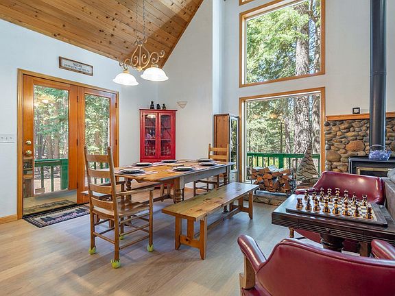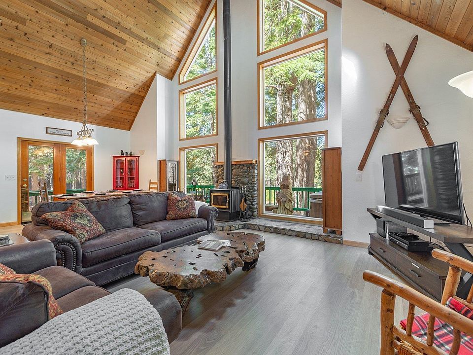 This charming mountain chalet, nestled in the coveted Tahoe Donner community, promises an exceptional retreat. Situated on a tranquil street in a lovely forest setting, the classic 3-story chalet design features vaulted pine ceilings, an inviting open great room and soaring windows looking out to a serene forest view. The main level showcases a spacious living room with a cozy wood stove, a generous dining area, and a brand-new gourmet kitchen boasting elegant quartz countertops, maple cabinets, breakfast bar, and newer stainless steel appliances. The main level also includes two comfortable bedrooms, full bathroom, a laundry closet, and a large deck perfect for outdoor relaxation. The upper level is home to an open loft and a light and bright serene master suite with vaulted pine ceilings and an ensuite bathroom, offering a private sanctuary. On the lower level, a versatile rec room or potential fourth bedroom with its own separate entrance provides flexibility and additional space. All floors enjoy brand new flooring including beautiful Pergo water-resistant laminate throughout the main level, and new carpeting in the upstairs loft and master bedroom. And enjoy the spacious rear deck as you soak in the relaxing hot tub. Conveniently located just minutes from downtown Truckee and major ski resorts such as Sugar Bowl, Palisades, and Northstar, this home is ideal for enjoying both winter sports and summer adventures. Experience the Sierra outdoor lifestyle and take advantage of the full range of amenities offered by Tahoe Donner. This chalet could be your perfect mountain retreat!
