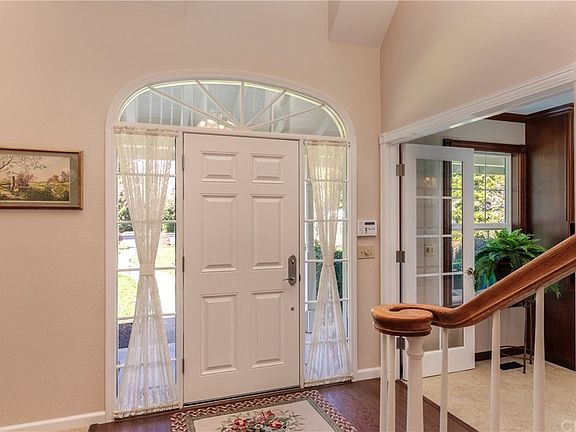 Enjoy rural neighborhood living on 1.88 acres that backs to the orchards in this custom home! Two story ceilings, recessed lighting, and built-ins throughout this home features a 50 year presidential roof, 4 bedrooms, 3 bathrooms, PLUS a gorgeous office with french door entry, mahogany built in cabinetry, gas fireplace with granite surround and Murphy bed! Recently remodeled bathrooms, laundry, kitchen, windows & paint! The family room has gas fireplace & oversized windows overlooking the back patio allowing tons of natural light into the home. The kitchen has quartzite counters, hardwood floors, built in soft close pots/pans drawers, double ovens, built in coffee bar, under cabinet lighting, utility sink, wine fridge and walk-in pantry. Laundry room has floor to ceiling cabinetry, counterspace and built in clothes hangers! The Master suite is located on the main level with huge walk-in closet, soaking tub, walk in shower with frosted window work, double sinks, and private backyard access. The remaining bedrooms and second master suite are located upstairs off of the loft overlooking the living room and formal dining room! The loft creates the perfect entertaining area with bonus (144sf) closet/storage space! This backyard has a huge covered concrete patio with outdoor kitchen equipped with built in stainless steel BBQ, ceiling fans, fireplace AND TV! Plus pool with waterfall, dog run, mature landscaping, owned solar & 4 bay carport perfect for storing large toys, cars, etc!