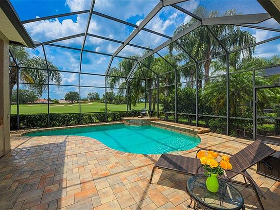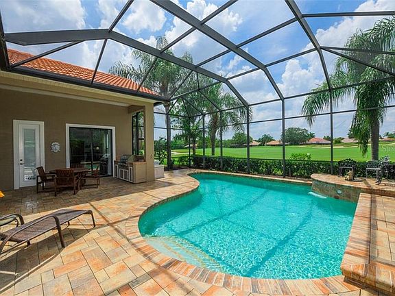 Poised amid lush landscaping on a premier maintenance-free golf course home site, this immaculately maintained home is designed to complement relaxed Florida living. Freshly painted in on-trend neutral tones, this three bedroom home is move-in ready with an elegant balance of formal & casual spaces and beautiful architectural details. Entertain in style from the living and dining rooms and effortlessly refine your favorite recipes in the deluxe kitchen, with granite counters, under mount lighting, center island, ample cabinetry, and a dinette with aquarium windows. The great room features custom shelving, cabinetry, and wet bar with wine rack. The spacious master retreat offers sitting area with bay windows, his and her closets and a master bath dual sinks, garden tub, and walk-in shower. With private golf course views, the oversized outdoor living area offers a large sparkling pool with pavers, 2 covered entertaining areas, and a well-appointed summer kitchen that invites alfresco dining. There are 2 additional bedrooms adjoining a bathroom as well as a handsome office/den with sliders to the lanai and an en suite pool bath in the back of the home overlooking the golf course. Residents of The Lakewood Ranch Golf & Country Club are just minutes from excellent shopping, dining, medical facilities & I-75, for an unparalleled lifestyle defined by relaxation and recreation.