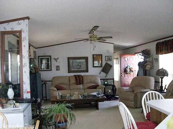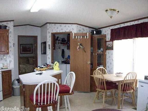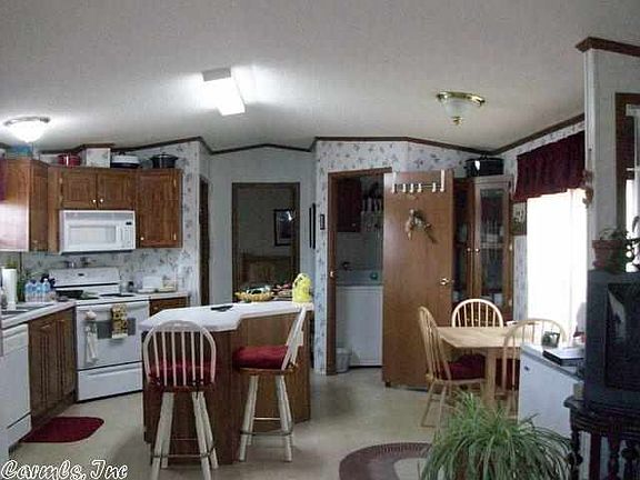 Very nice single wide mobile home on 3 acres. Very well cared for, very pretty carpet, neutral colors, pantry and island in the kitchen, nice size laundry room. Split floor plan, garden tub in master bath, front porch, covered metal carport stays and so does the metal storage container. Nice garden spot and pretty landscaping. Seller does not own minerals so they do not convey. Seller says both Searcy and Pangburn School busses go by her house. MH is tied down well with 12 concrete runners.