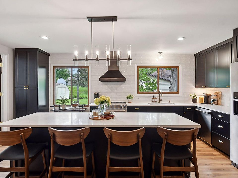 This rambler offers an open-concept main level that features a modern living area and a fully updated kitchen with a large island, custom cabinetry, quartz countertops, and high-end stainless-steel appliances—perfect for cooking and gathering.