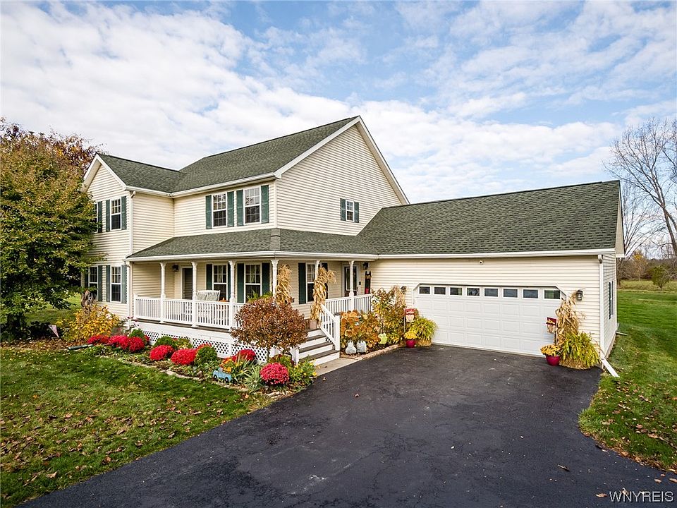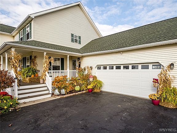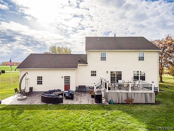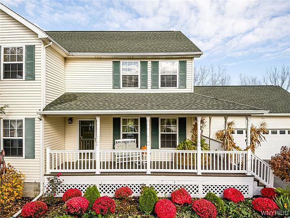 Well maintained 4 bedroom 2.5 bath, almost 2500 sqft house situated on 6.4 acres! Beautifully updated kitchen with newer cabinets, granite countertops, and appliances that stay. Laundry and 1/2 bath on the first floor for convenience. Formal dining room, living room, and family room currently being used as an office. Upstairs has 4 bedrooms and 2 full baths. New flooring just added to the master bath (not in photos). Newer geothermal heating and water tank added in 2015 so no crazy propane/gas bills in the winter. There is a propane tank on site for the backup generator and fireplace in the living room. This home is super efficient and secluded but still close to all modern conveniences. The garden was added this year and the owner even had water and electric ran to it. Beautiful views right off your back deck, and there's still plenty of trees in the back for added privacy. The septic was just pumped and inspected last year, Amish shed for extra storage, and the attached 2 car garage. With the purchase of this home you will receive 2024 Bills season tickets Section 315, row 12, seats 1 and 2.