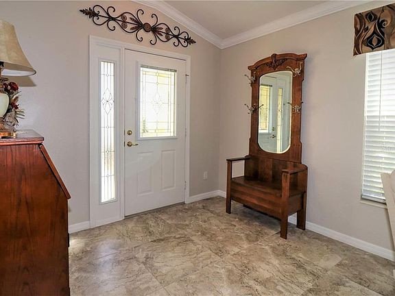 Pride of ownership abounds in this CBS 2/2/2 open floor plan Alydar. Picture perfect in every way. Designer driveway and walkway. Leaded glass front door with matching side window. Designer wall color and ceiling fans. Newer 24" ceramic tile in heavy traffic areas. Bedrooms are carpeted. Upgraded stainless steel kitchen appliances (smooth top stove, beverage compartment in refrigerator, self venting microwave); breakfast bar, closet pantry and eat-in kitchen. Inside laundry with upper cabinetry for storage. Enclosed lanai (acrylic windows, ceramic tile flooring, lighted ceiling fan, roller shades). Two-car garage features privacy screen, key-less entry, pull-down stairs & storage, solar attic fan and workbench. Power awnings on lanai. Shingles 2014. HVAC 2019 with April Aire and Humidistat. Extra nice and clean.