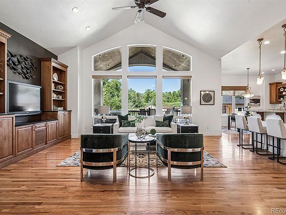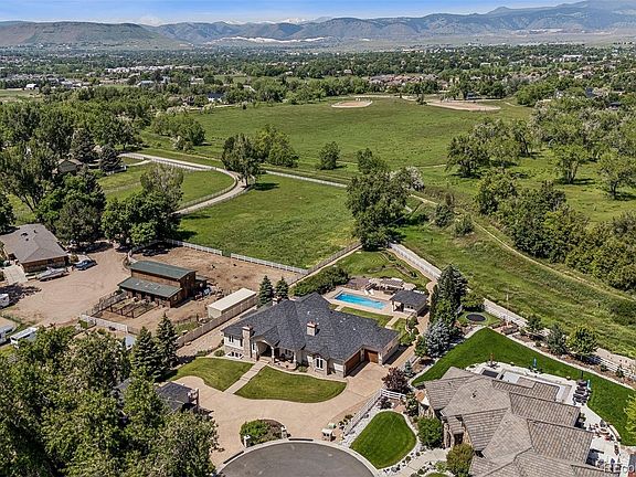 Located in Arvada’s coveted Eagleview Estates, this exceptional residence offers luxurious living with sweeping views of Colorado’s Front Range, including Mount Blue Sky. The main level features vaulted ceilings, a sunlit dining area, a private office with custom built-ins and a gas fireplace, and a beautiful great room with built-ins, a gas fireplace, and expansive windows that frame the serene mountain backdrop. The open-concept kitchen is a chef’s dream with slab granite countertops, custom cabinetry, and top-of-the-line appliances. The private primary suite is a true retreat, situated in its own wing with a sitting area, deck access, and incredible views. The spacious 5-piece bath includes a large fitted closet with a granite-top island, and a stack washer/dryer. The walk-out lower level includes three additional bedrooms—two with en-suite baths, a family room with full bar and covered patio access, and a custom movie theater with surround sound, velvet curtains, and stepped seating. Outside, enjoy a resort-style setting with a pool, hot tub, a pool house with changing room, an outdoor kitchen with built-in grill, a pergola-covered lounge, and a gas fireplace—all set against uninterrupted mountain views. A back gate leads directly to Arvada’s 150+ mile trail network and a bridle path to the neighborhood elementary school. This property also offers a detached 2-car garage with a fully finished guest house/flex space above that includes an open living room/studio space with mini-kitchen, 3/4 bath, central A/C and heat, and a west-facing balcony. Additional highlights include an attached 3-car garage, three laundry areas, new interior paint, and new carpet throughout the lower level, primary suite, and guest bedroom. This is Colorado living at its finest.