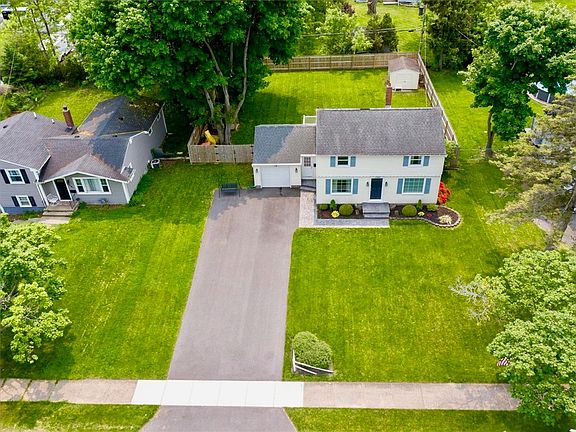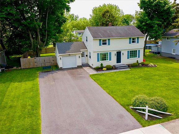 Welcome to this beautifully updated and spacious 3-bedroom, 1.5-bath Colonial! The home features new flooring throughout, including a kitchen floor installed in 2025 and quartz countertops added in 2021. Enjoy the comfort of central air, newer vinyl windows, and a partially finished basement. Step outside to a fully fenced backyard (2022) with a large deck and vinyl railings (2024), a custom patio (2022), and a shed—ideal for relaxing or entertaining. Major upgrades include a New furnace (2022), Newer hot water tank, a full Double-wide driveway replacement (2023), and a stamped concrete walkway (2022). The 1.5-car attached garage adds convenience, and all appliances—washer and dryer included—stay with the home. Just minutes from Lake Ontario! **Delayed negotiations until Tuesday, June 10th at 1:00 PM.**