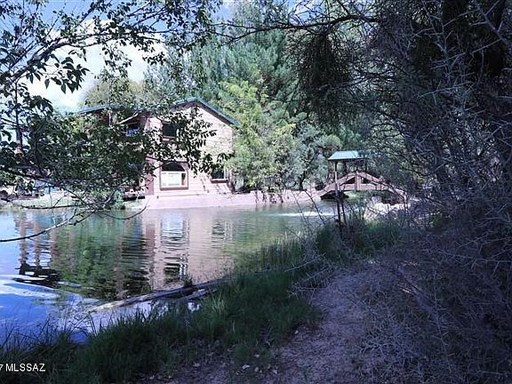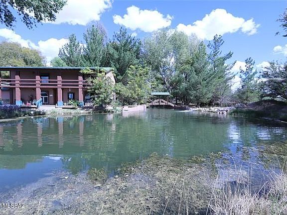 Country Estate home near Benson & St David, AZ. S of Tucson. This estate resides on 70 lush acres. The custom built main house has two stories, 2 bedrooms with a third room. 3 baths, kitchen, dining room, breakfast room, living room, family room AND a basement. The main house house is surrounded on three sides by a man made lake. The main house has full length porches on both levels revealing beautiful views. The man made lake has fish. The house is surrounded by mature trees and vegetation. Access to the main house on one side is by foot or vehicle and the other by a foot bridge over the lake. There are irrigated pastures. The estate has a huge 1000'+ workshop next to the rustic guest house. The guest house has 2 bedrooms, one bath, eat in kitchen & living room