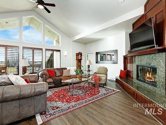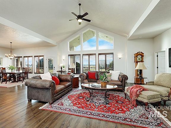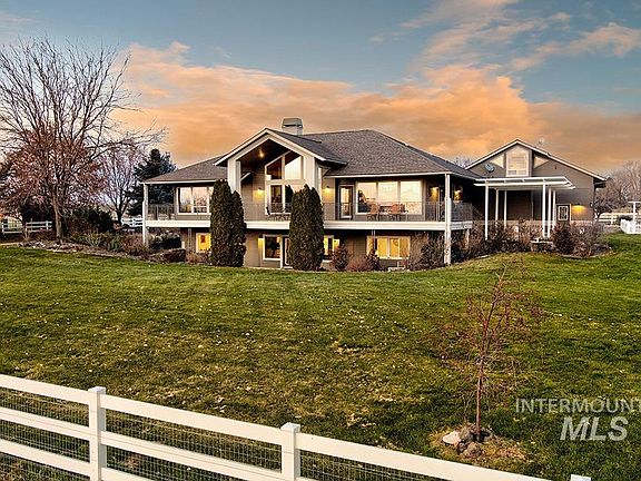 Close-in country living on 10 blissful acres, surrounded in Idaho's natural beauty! Set in Meridian at the end of a secluded drive, the pastoral feeling of open air, slower pace of living, and farming opportunities create a truly remarkable rural escape. The property benefits from a farm and ranch tax exemption, providing a substantial reduction in property taxes. Dynamic cathedral ceilings and architectural windows introduce the beautifully updated custom-built residence, wrapped in wide-open views of the grounds and rolling foothills. For the at-home chef, the expansive gourmet kitchen is outfitted with a premier appliance package, dual sinks, solid cherry cabinetry, and a large walk-in pantry. Durable wood-like flooring spans throughout the main level into the peaceful primary retreat with stunning views of the Owyhees, an en suite bathroom, and a large walk-in closet.
