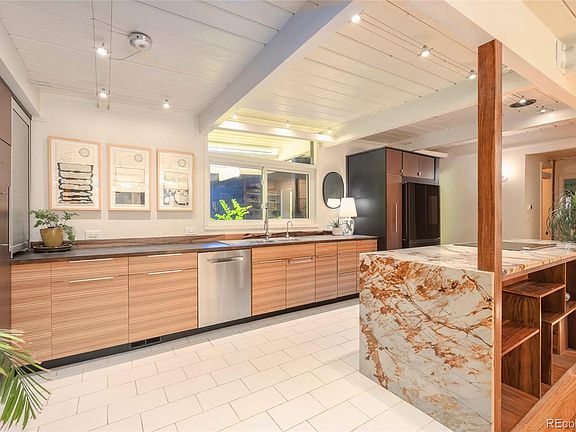 Unique opportunity to personalize this mid-century modern home in Krisana Park with your vision. Situated on one of the largest - 13,455 square foot, corner lots in the neighborhood with an oversized 2 car garage! Three bedrooms plus bonus office and three baths spread across 2,056 square feet, the residence features floor-to-ceiling windows, T&G ceilings, and open floor plan including a custom kitchen with a waterfall island and butcher block countertops, seamlessly connecting to a spacious fenced courtyard. The primary suite offers access to a backyard patio and en-suite bath with double vanity, walk-in shower, and walk-in closet space. Potential to turn the office space into a fourth bedroom; the space has brand new flooring and is currently utilized as an office. Could be an additional suite for guests. There is room on the lot for an addition. Easy access to the highway, shopping, restaurants, and cherry creek trail!