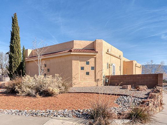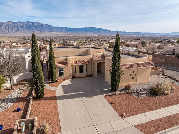 Spectacular views of the Sandias will delight you daily! This beautiful home boasts new carpet & paint & has been meticulously maintained. Open & bright kitchen w/a large pantry was remodeled apx 10 years ago with new cabinets, appliances & granite counters. Brkfst nook plus formal dining that could double as a second living room. The private yard is perfect for BBQ's or family gatherings with a shaded covered patio. Spacious bedrooms, large primary bathroom with double vanities, garden tub, shower & a large closet. A workbench & separate heated workshop in the garage is perfect for your tinkering needs. Plus there's two more storage sheds! Corner lot, refrigerated air & new water heater & furnace in 2022. Great location by Intel, shopping or drop into Corrales for coffee or lunch!