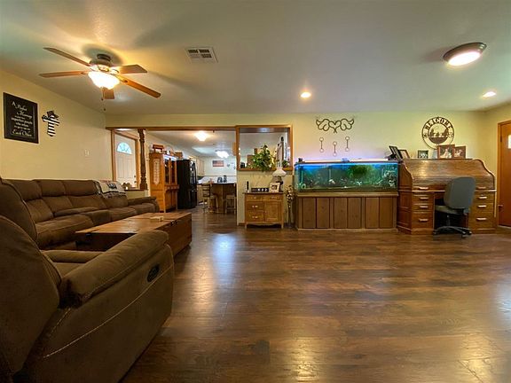 Acreage, barns, buildings, and set up for your livestock! With the rare find of 19.05 acres and only one-half mile off of a paved road, this property is what you have been searching for and it is MOVE in ready! A new roof, windows and extension of the concrete porch were completed in the last 3 years. Inside this well-maintained ranch you will find lots of updates throughout and a nice open layout! The large living room has new flooring throughout and is open to the completely remodeled kitchen! In the kitchen you will love the large eating island, new custom counter tops, lots of cabinets, pantry with real barn door and the option for either gas or electric stove! The master bedroom is spacious and you will love the HUGE walk-in closet! The two additional bedrooms are equal in size and are perfect for bedrooms or a guest bed and an office. Down the hall you have an updated bathroom, half bath, large laundry area, additional storage closets, whole house attic fan, and concrete safe room 8X6 that includes a steel safe. Outside on top of 19.05 acres you will be excited to find a newly added garage- 40X30 building with concrete floors, 3- 10x10 overhead doors, electric for your equipment including 220v, insulated, and with propane heater. The 500-gallon propane tank is owned. There is a 60x70 livestock barn, 2 pole barns and a grain barn for all your equipment storage. The property has two ponds, the larger pond stocked with bass. The property is also fenced for your horses or cattle with brand new 6 strand fencing on the west side of the property and newer 5 strand on the north. A round pen for your horses, chicken coop with fenced chicken yard, and a grain bin gazebo round out the property. This is a rare and unique find, so do not delay and call today to schedule your private showing!