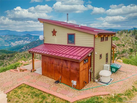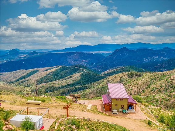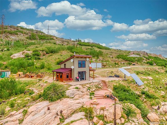 As featured on A&E's Tiny House Nation, this 2014 custom 1 1/2 story is gently perched on the south side of a mountain, on almost 37 acres abutting thousands of acres of Jeffco and Denver open space, with 'knock your socks off' views from Pikes Peak to Kenosha pass. Privacy galore with space to roam on the land. A 'Tiny Mansion' show home featuring an open floor plan with a soaring 20' ceiling, a Hearthstone Hase-Bari wood-stove, a compact gourmet kitchen with marble countertops and a professional Blue Star range, tiled bathroom with custom glass shower door, custom beetle kill pine barn wood doors, radiant in-floor heating, tongue and groove beetle kill pine ceiling and an amazing 72" ceiling fan! Custom metalwork on the balcony and stairs. Loft master bedroom includes his and hers custom Elfa closet systems. Two tiny bedrooms on the main level one with a 7' custom beetle-kill live-edge pine slab desk that converts to a twin bed, the other with a 7' daybed and built-in beetle-kill live-edge pine slab desk. Never pay another electric bill again with your fully 'off-grid', state of the art solar system, 11KW back-up generator, and super High-speed FREE internet included!. Watch the weather change and the eagles fly by as you enjoy the 'infinity patios' and a fire crackles in the custom flagstone fire pit. large storage container plus another one finished into studio/living space and a liveable Yurt on a large, sturdy wooden platform. You will happily quarantine here with no complaint! But still, you're just 20 minutes to the grocery and 45 minutes to Denver. Secure behind a locked gate on a private road. Full disclosure.. you'll want 4WD in the winter. Some pictures are pre-tenant and some are current with tenant. OPTIONAL OPPORTUNITY: Build your dream home on this incredible site and keep the tiny-home as a legal ADU. Seller is a licensed real estate agent. BUYER TERMINATED. CALL KC BUTLER WITH ANY QUESTIONS.