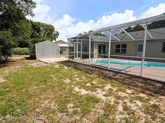 Active Under Contract - Accepting Back Up Offers. Check out this AFFORDABLE POOL HOME that is convenient to everything! Don't let the age fool you... this home offers many of the features newer homes offer WITHOUT COSTLY RESTRICTIVE HOA RULES OR CDD FEES. These great features include NEW ROOF 2022, NEW AC SYSTEM 2020, and DOUBLE PANE WINDOWS. The open kitchen features a huge breakfast bar, eat in area and French door pool access. The open floor plan and vaulted ceilings make the interior feel very spacious. Master suite features an updated bath with Quartz vanity, slate tile floors and slate tile shower plus a spacious 5'6'x 6'6' walk in closet. Guest bedroom 2 offers a cedar lined closet for safe storage of clothes and linens. Seller is including a large 12'x20' storage shed. The rear yard is completely fenced and is a great space for pets or children to play. Very conveniently located to shopping, hospital, schools, and Gulf beaches or boat ramps. Only minutes to local places of interest including: Weeki Wachee state park, Pine Island beach, Hudson beach, and 1,000's of acres of state recreation lands.
