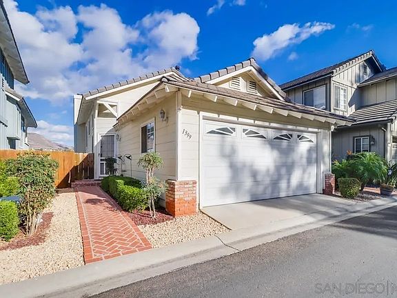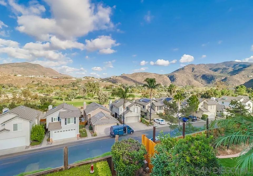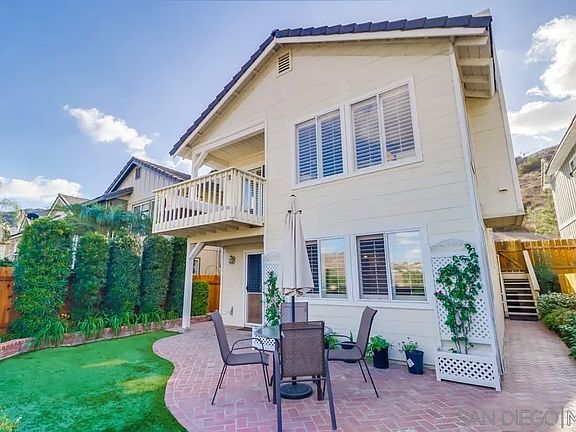 Nestled peacefully in arguably the most beautiful mountain setting in San Diego, this house and its gorgeous views will not disappoint. The spacious two story home with an attached two car garage is a 2 br 2.5 bath house with the living area upstairs. As such, the views provided by the second floor windows and the balcony will nearly take your breath away! There is also a golf course at the base of the mountains that presents a park-like setting with lots of green grass, trees, and water. Nature lovers will delight in all the wildlife the area attracts. The house itself has an enclosed back yard with artificial grass, a brick patio, and a well-manicured array of flowers and plants that create the perfect place for entertaining guests or simply enjoying a relaxing cup of coffee in our lovely San Diego weather. Inside the house you have an open concept living area with vaulted ceilings, a fireplace, and a remodeled kitchen with maple cabinetry, granite countertops, and newer stainless steel appliances. The kitchen area also has a beautiful three person breakfast nook with a sturdy maple wood table matching the cabinetry. The nook and extra cabinets in the area were all carefully added to the home and give it a comfortable sitting and dining area that other houses in the area simply don’t provide. Each window in the house is also beautifully decorated with white wood blinds that add a touch of elegance to every room. And finally, this house provides you with the security and peace of mind that comes with living in a gated community. Reasonable HOA fees allow you