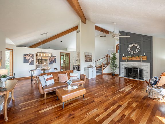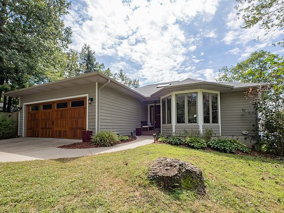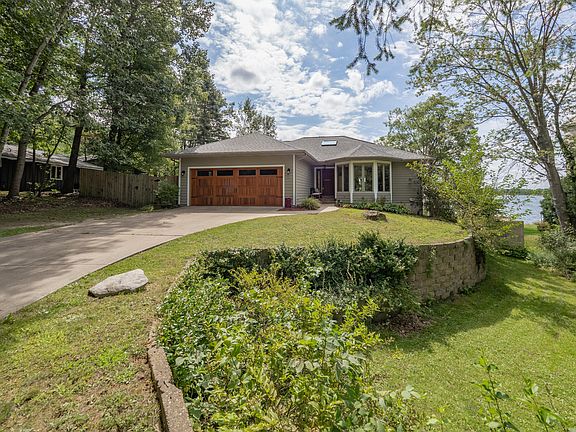 Welcome to your lakefront retreat! This custom 3-bedroom, 2.5-bath home offers 2,700 sq ft of finished living space, sitting on a wooded .67-acre lot with 126 feet of natural frontage on private, all-sport Lake Doster. The main floor is a standout, featuring dramatic cathedral ceilings, rich cherry flooring, & panoramic views of the lake. The bright & spacious great room has an updated fireplace & surround, perfect for enjoying stunning sunrises & sunsets. The kitchen has been refreshed with new quartz countertops, a striking tile backsplash, & updated appliances. Just off the kitchen is a lovely eating area with large bay windows allowing for lots of natural light. The walk-up primary suite showcases incredible lake views, a cozy wood fireplace, an ensuite bath with a whirlpool tub, & a walk-in closet. The lower-level walkout is designed for relaxation & entertainment, with a spacious rec room, a wood-burning fireplace, two additional bedrooms, a full bath, & a second kitchen. Embrace lake life with a brand-new floating dock, making it easy to enjoy all your favorite water activities The natural frontage includes an active spring on the south side, adding to the property's charm. The side yard is fully fenced, perfect for your furry friends. Other highlights include a brand-new composite deck with wood steps leading to the lake, a Generac generator, updated pull-down shades, a Kinetico water softener, a new AC unit (2022), & a roof installed within the last four years. This lakefront retreat awaits you!