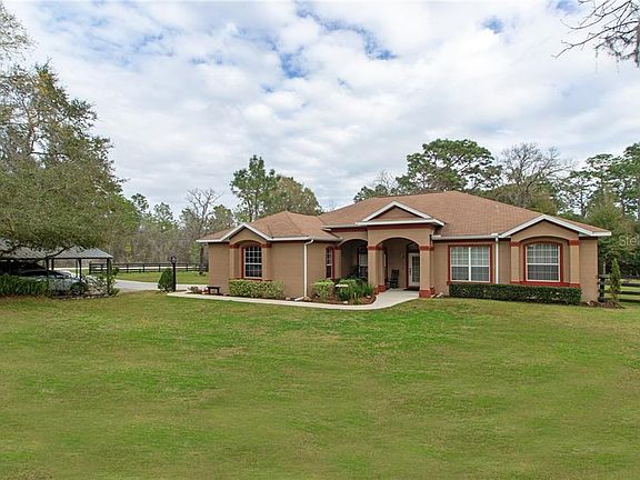 Magnificent Triple Crown custom built split plan home on 1.7 acres. The custom touches include soaring 9 foot ceilings, extra tall doorways, lots of storage, huge closets just to name a few. The Master Suite is enormous. the floor plan allows that this could actually be an In Law Suite separate from the other living areas. The rear of the house facing the yard gives panoramic views of the "Park Like" setting. Winding, manicured paths will take you on a zen like journey to the rustic "Farmhouse Style" 16x18 barn that can have many uses. Could be a She shed, man cave, currently used to store equipment and you can also eat off the rubber barrier floor. the frame of this barn are actually re purposed telephone poles. Storage shed 16x11, carport 20x24 is onsite too! The man made rock stream has resident Koi fish. The location is nestled among rolling vistas of horse farms yet convenient to booming Ocala and Dunnellon. This is a great place for entertaining all ages with lots of space for large gatherings for any occasion! Stay tuned for pro pictures!! Seller says to BRING OFFERS! Main A/C is less than 3 years old as is the drainfield.