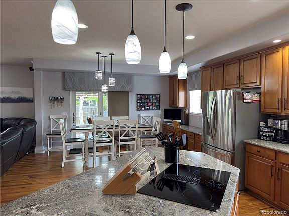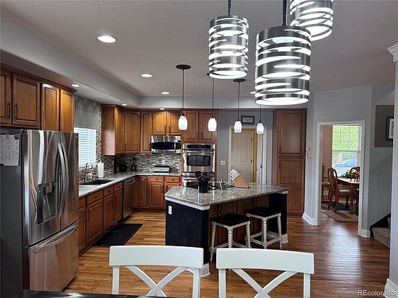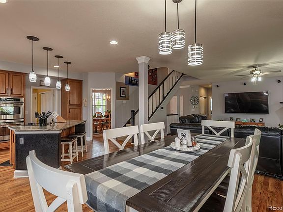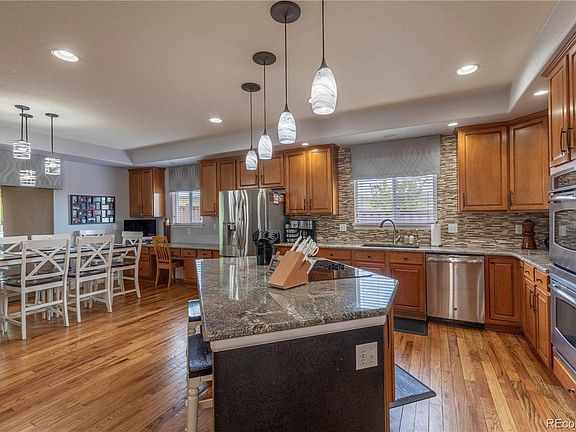 Welcome to Homestead Hills, where this exquisite Morrison Home awaits you. Situated outside the Metro District, this neighborhood offers affordability with lowered taxes, amplifying your purchasing potential. This captivating 2-story residence boasts 4 bedrooms, 5 baths, a finished basement, a 3-car garage and is move-in ready. Entertain effortlessly on the main level in the gourmet kitchen, seamlessly connected to the family room adorned with soaring ceilings and a stunning fireplace. Formal dining adds elegance, while the main floor study, embellished with wainscoting, caters perfectly to remote working couples. A bonus room in the basement provides additional workspace. Upstairs, the primary bedroom is a sanctuary with its vaulted ceiling and see-through fireplace leading to a spa-like 5-piece bath. The fully custom walk-in closet is unparalleled and will compete with best custom homes. An ensuite with a full bath caters to guests or family members, while two more bedrooms share a Jack and Jill bath. The basement is an entertainment haven, featuring a custom wet-bar, game room, 3/4 bath, and two versatile bonus rooms for work or hobbies. Step outside to the backyard oasis, complete with a water feature, hot-tub, expansive low-maintenance deck, and custom covered patio with a vaulted ceiling, tongue and grove finishes and ceiling fan, ideal for hosting summer gatherings and making memories. Additional features include attic fan, hardwoods, granite countertops, custom paint, laundry shoot, an open floor plan, and proximity to open space and park. Don't miss the opportunity to make this remarkable home yours!