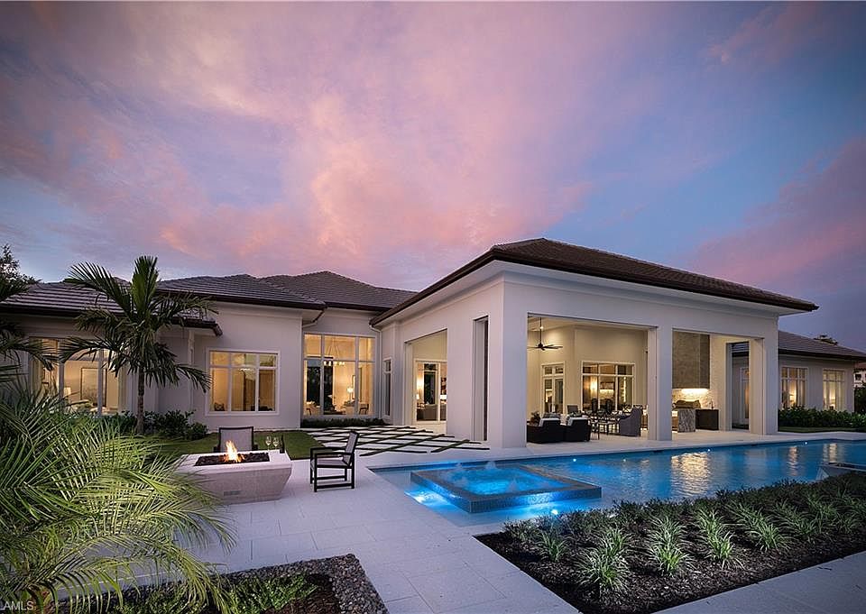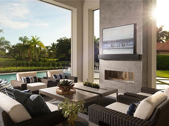 The Streamsong by Seagate Development Group with interiors by Theory Design features 5,295 square feet under air and a 1,191 square foot outdoor living area. The exterior of the home includes a covered entry sequence lined by columns and a series of planters. Double doors open to a foyer and a grand reception room adjacent to the great room. The great room opens to a covered lanai with a fireplace, an island kitchen, and conversation and dining areas. Inside, the great room anchors a space that includes a dining area and a double-island kitchen. A hallway overlooking a garden courtyard leads from the living area to a club room and three guest suites, each of which has a full bath and one of which opens to the outdoor living area. A study/office is located at the opposite end of the hallway, just outside an owner's suite that includes a vestibule, a bedroom that opens to the outdoors, two walk-in closets, and a bath with his and her water closets, his and her vanities, a free-standing tub, and a walk-in shower. This home is stunning! Home is open daily 11:00AM-4:00PM.
