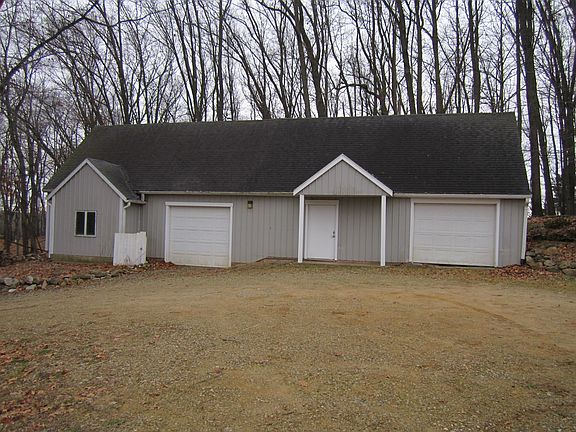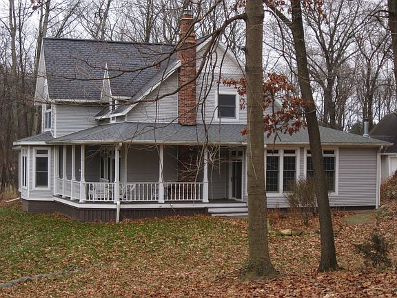 NEW REDUCED PRICE, new Kitchen Floor and Sink. Farmhouse style with modern open floor plan. First floor kitchen, dining, den/office, living room with gas fireplace and master bedroom with full bath, plus half bath by back entrance doorway. Wrap around front and side porch. Second floor has three bedrooms and a full bath. There is an attached two car garage and a unattached grage type building. Five acres of rolling hills and woods.