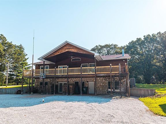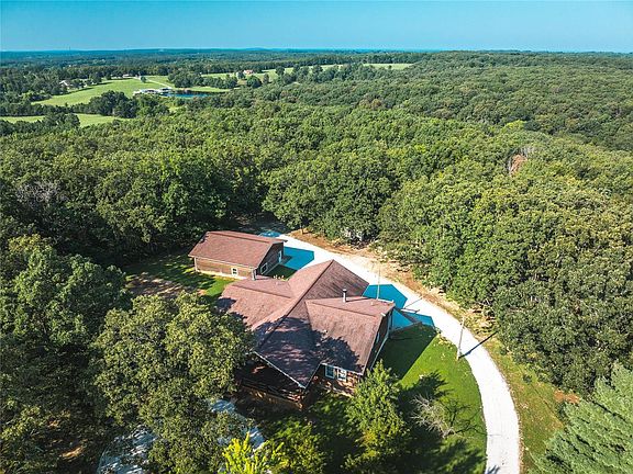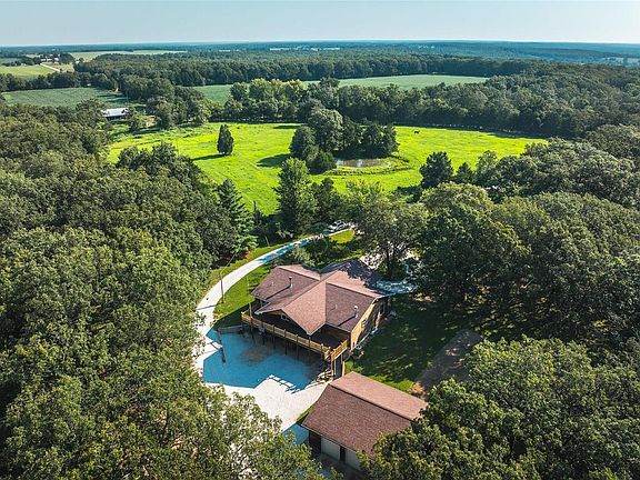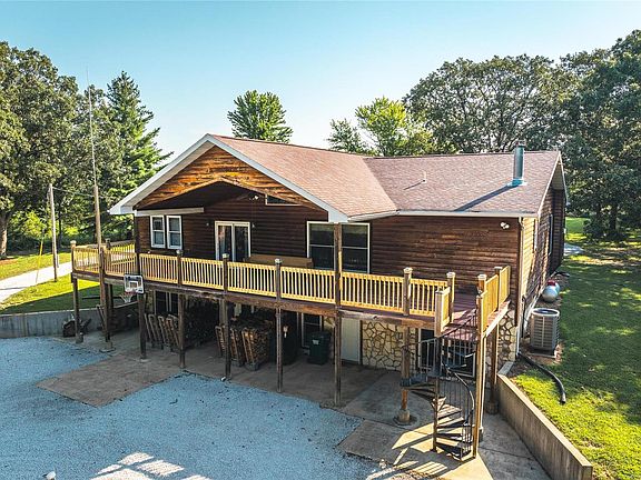 Potentially assumable loan at 2.25% interest rate and ~277k remaining! Discover your dream home in Vichy with this stunning 4-bed, 3-bath custom log home. Nestled on 19.8 acres of serene woodland, this property features a spacious open floor plan with gorgeous wood accents and striking cedar staircase, vaulted ceiling, a chef’s kitchen with large center island, a main level primary suite with its own sitting area and gas fireplace, two jetted tubs, and huge covered balcony. The basement was recently stripped for a remodel and is ready to refinish your way. It includes a second kitchen, family room, bedroom, bathroom, multiple bonus rooms and tons of storage space. The approx 1400sqft 3-car detached garage is big enough to park an RV, and has extra workshop space. The home is equipped with high speed Starlink internet and new heating, air conditioner, and sump pump. A potential homesteaders dream, the property has a 60x60ft tilled garden area, playground, and multiple fruit trees.