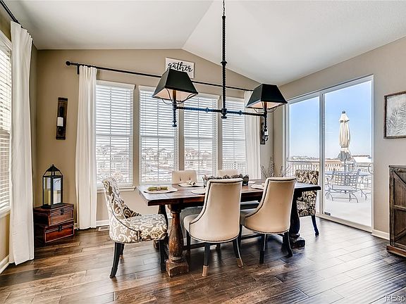 Are you looking for seriously gorgeous finishes, a beautiful lot backing to open space, stunning mountain views topped with an incredible location, easy highway access, loads of shopping & dining nearby? This stunning Alison model (one of Richmond's all-time most popular floorplans) is all of that & more! Loaded with upgrades, like 5 inch wood flooring, brand new carpeting, & 8' doors, you'll feel like you're in a model home. The heart of this home is a phenomenal gourmet kitchen with highly upgraded cabinetry, solid surface countertops, stainless steel appliances including a gas range & double ovens. A large island is perfect seating for a quick bite, or an elaborate buffet setup for entertaining. The gorgeous sunroom (a $25,000 builder option!) serves as the perfect dining space, with natural light streaming in through walls of windows. The warm and inviting family room, boasts the extended square footage option, and a recently updated gas fireplace w/ floor to ceiling shiplap treatment. Upstairs, you'll find 4 bedrooms, with an enormous loft that can easily function as a 2nd family room or rec room. The luxurious owners suite w/ coffered ceiling looks west to beautiful open space & mountain views. The master bath is the perfect respite from a long day with an oversized soaking tub for 2, walk in shower, and dual sinks. Convenient upstairs laundry room makes laundry (almost) tolerable, and features a mud sink and built in cabinetry. 3 additional spacious bedrooms allows everyone to be on the same floor for sleeping, allowing for peaceful sleep at night. A large walkout basement is ready to be finished with 9' ceilings, The professionally landscaped backyard means you'll be enjoying summer BBQ's on the rear deck, and plenty of grassy space to play! Meridian Village is well loved by residents, with a community pool, 4 parks, miles of trails and quick access to both Lone Tree & Parker!