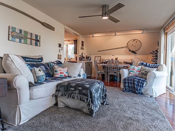 This charming A-frame retreat is designed for low-maintenance living and maximum enjoyment. Step inside to an inviting open living space, where expansive sliding doors flood the room with natural light and bring the outdoors in. The updated kitchen is perfect for preparing meals after a day at the lake, and the main-level bedroom and full bath offer convenience and comfort. Upstairs, you’ll find two generously sized bedrooms, ideal for friends or guests. Outside, soak in sweeping country views from the spacious decks, unwind around the stunning limestone fire pit, or simply enjoy the serene surroundings. The oversized two-stall garage provides ample space for storing your lake toys or transforming into the ultimate hangout spot. With durable vinyl siding and a metal roof, this home is as worry-free as it is welcoming—allowing you more time to relax and savor the lake life. Don’t miss your chance to own this perfect lakeside retreat! Home is situated on a double lot but has one tax ID.