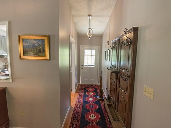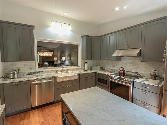 Beginning in the Foyer & running throughout are BEAUTIFUL reclaimed Heart Pine floors. The open Living Room/ Dining Room has a stone fireplace w/ gas logs for those rainy cool evenings & sliding doors to the 27 x 7.6 glass enclosed sunroom. The kitchen was made for the chef (or the chef wannabe) w/ beautiful granite counters & tile backsplash, a farm sink, stainless steel appliances & plenty of cabinets (some cabinets w/ glass doors) plus a double set of windows for lots of natural lighting. A large pass-thru window from the kitchen to the dining area makes it easy to visit with guest while entertaining. The split bedroom plan has the master en-suite at the back of the unit w/ sliding doors to that sunroom where you can enjoy your morning coffee, a walk in closet, a walk-in shower & double vanity. The guest bedroom at the front of the unit has a walk-in closet & a set of double windows to allow that natural light to come in. The white tile surrounding the extra large soaking tub in the guest bathroom has a tile accent that looks like glass granite vanity top. At one end of the sunroom is a 7.6 x 5.6 storage room & off the dining area is the extra long single car garage.