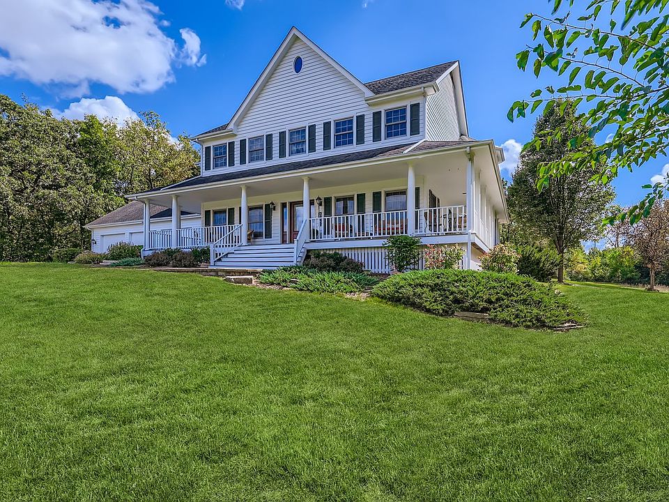 HIDDEN SANCTUARY adjacent to Burnidge Woods Forest Preserve! Custom built Colonial Revival style home w/large wrap around porch for relaxed living! Pride of ownership & quality radiate throughout! Rich hardwood flooring in entry, hall, kitchen, family room & dining room! Solid 6-panel doors & crown molding in much of the home, 9 ft ceilings on 1st floor! Kitchen features raised panel oak cabs, granite c-tops, island w/b/fast bar, double oven & walk-in closet pantry! Breakfast nook offers separate eating area. Formal dining room has tray ceiling, recessed lighting & bay window. Built-in bookcase & brick fireplace w/heatilator in spacious family room. Anderson sliding doors lead to enclosed sunroom w/skylites overlooking in-ground pool! 1st floor office w/French doors plus huge 2nd floor office, shown as 2nd BR. The 2nd floor office is a contractor's dream w/built-in cabinetry, file cabs, desk & drafting table, recessed ltg & W-I closet! This room might also be ideal for school projects or a homeschooling family! Primary BR has vaulted ceiling, vented Velux skylites, sitting area & dual closets! Dual vanity, jetted tub w/separate shower & private water closet in primary bath. Children's bath also has double vanity plus full bath w/shower. Wonderful finished bsmt features 5th BR & 4th full bath, built-in cabinets with a sink, ideal for kitchenette or entertaining guests! The finished area also features an insulated acoustical ceiling & new carpeting! Otherwise, there is a generous amount of storage space in the basement & throughout the home! Newer dual furnace & A/C units! Ionizer for water treatment, newer well pump & pressure tank. Large 200 amp electrical panel, plus dedicated panel for I-G pool. The heated garage measures 35x25 & has a 10'7" ceiling, plus service door to the back yard. Majestic 2.66 acre lot! This home simply must be seen in person!