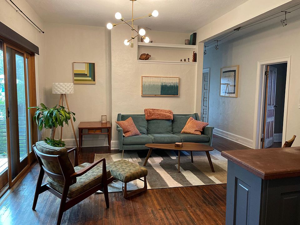 This modern, fully-furnished private home is centrally-located, minutes from South Slope, the River Arts District, and downtown. Central to both downtown and Biltmore village. Perfect for travel nurses or doctors that want to walk to Mission! This three bedroom house a private garden with two decks and a back porch for sipping morning coffee. The open floor plan with hard-wood floors allows the living room, kitchen and dining area to feel spacious and connected. The kitchen has a gas stove, garbage disposal and new dishwasher. Modern furniture and quaint built-ins give this 1920's home style. The bathroom has a shower and classic clawfoot tub for bathing. There is a finished loft space for yoga, quiet time, or quite office. The den is perfect for reading or study or TV watching. There's a Nest thermostat making heating and cooling easy and programmable. Both queen beds have brand new Nectar mattresses! Month long lease or longer. Renter responsible for utilities. Street parking only. No smoking. Month long leases with option to extend. Renter can furnish loft as they wish!