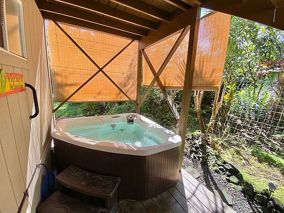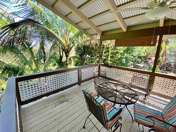 Great value for this large well built home with an independent "ohana studio" (Total of 3 Bed / 3 Bath) , located in a serene, mostly undeveloped part of Nanawale Estates. Mature landscaping, beautiful palms and several fruit trees. With no less than 3 inviting covered lanais, this home was made for outdoor Hawaii living. The large living room with an open floor concept, wide windows and cathedral ceiling, allows for spacious living. Plenty of space in the kitchen, equipped with modern appliances, for your culinary creations with numerous cabinets, generous counter space, a beautiful koa wood island custom made by the owner, and a pantry . The main bedroom boasts its own on-suite, a walk-in closet, and numerous windows to enjoy the sunrise. The guest bedroom is large, bright and adjacent to the common bathroom. Multiple fans and the higher ground provide for extra air flow... The rear lanai has its own stairwell to the gardens behind the house and access to the spa downstairs. The front upstairs lanai also has its own staircase with a gorgeous view of the surroundings. Lower level consists of 2 covered lanais (One with the hot tub) , the "ohana studio" unit, covered parking, storage, utility room, and a laundry room. The unit has its own bathroom and cooking area and is perfect for extended family and visitors. Must see in person to appreciate. Video available.