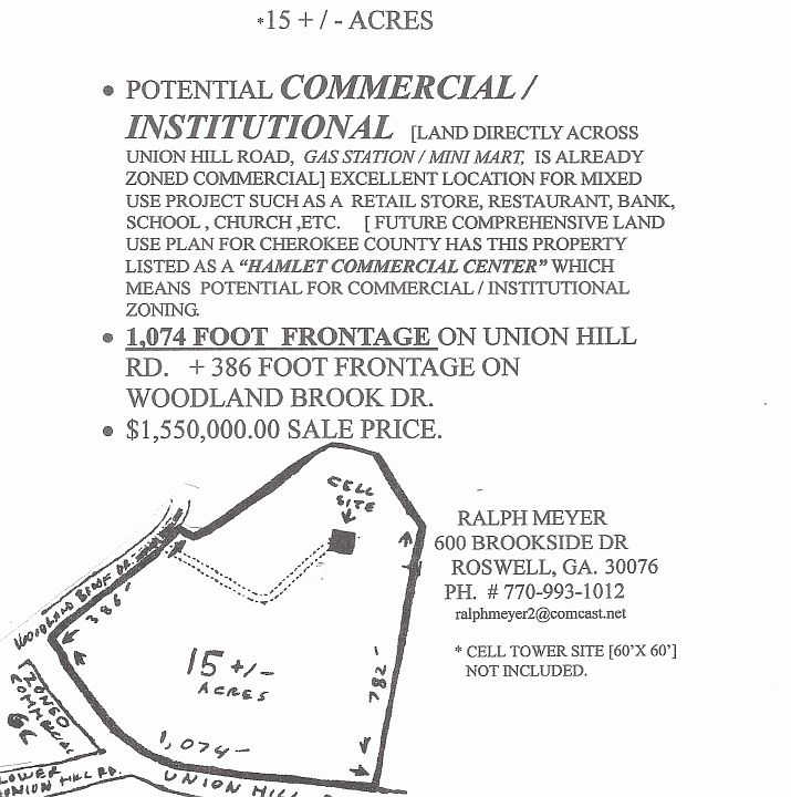 Excellent topography, Very Fast growing area of southeast Cherokee County Georgia with over 1,000 Feet frontage on Union Hill Road at lower Union Hill Road. Land directly across the road is already zoned commercial.