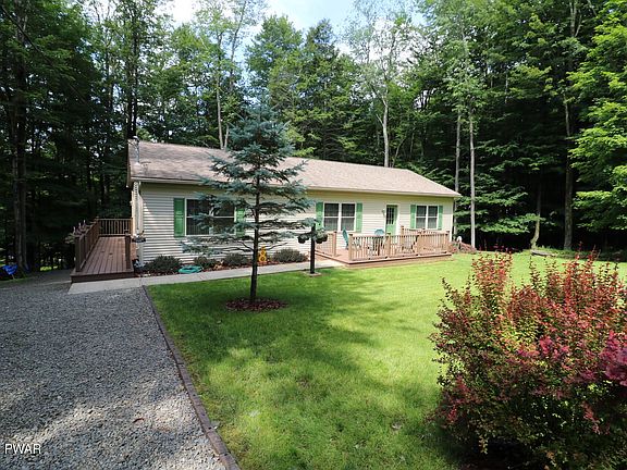 Next to new ranch home in the wonderful community Indian Rocks which offers access to Lake Wallenpaupack with dock slips available!! Situated on a triple lot with 1.41 acres privacy abounds! Open floor plan, spacious rooms, high quality kitchen cabinets, high end vinyl deck railings, outdoor fire pit, ALL plywood construction (no OSB board here)! Full basement can easily be finished for additional living space and is already plumbed for a 3rd full bathroom! Spacious outdoor deck with a ton of privacy! Bonus! All major furnishings included!