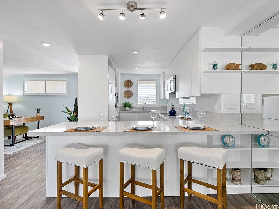 Welcome home to this one of-a-kind, modern 2-bedroom condo located close to everything Kailua has to offer; a truly luxurious living experience in a prime location. With contemporary design and high-end finishes this rarely available corner property at Meridian East exudes pride of ownership. Enjoy cool trade winds and natural light throughout. Uniquely situated for stunning sunset and sunrise views from the heart of the gourmet kitchen to the expansive private lanai. The well-appointed kitchen is a culinary enthusiast's dream, featuring top-of-the-line Bosch appliances with induction cooktop, Quartz countertops and luxury custom cabinetry for the perfect blend of functionality and elegance. No expense was spared in the meticulous remodel including porcelain tile shower, contemporary Low Iron Etched Glass doors and more. Highly desirable Meridian East offers excellent amenities - secure personal storage areas, newly upgraded lobby, gated bike and board storage and refreshing, sparkling pool just to name a few. With impeccable finishes, panoramic views and a perfect location, don't miss this opportunity to experience the ultimate Kailua lifestyle at this exceptional residence.