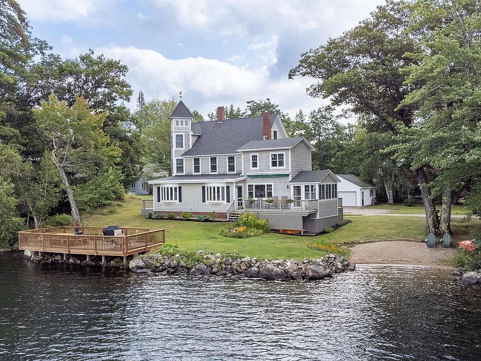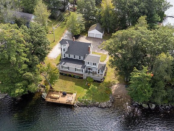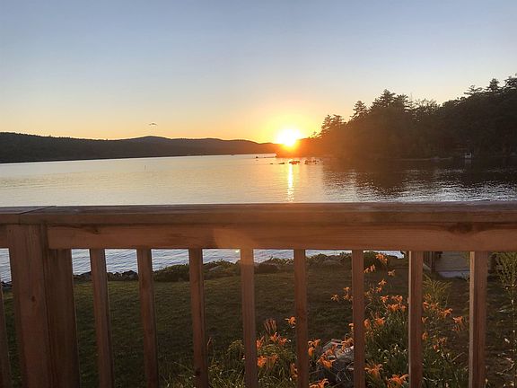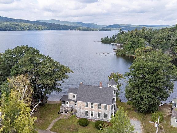 Stately & Serene this Lake Waukewan Waterfront home exudes old world charm and features the most spectacular sunsets, sandy beach, seasonal dock and 115' of pristine waterfront combined into one fabulous residence. Featuring Nantucket style shingle exterior, an enchanting turret, lake facing porch, cozy enclosed porch and waterside deck this home is perfectly sited to maximize long lake and mountain views. As the seasons change and the sun sets, each new perspective treats you to a fresh example of nature's imagery. Ideally located approx. 1/2 mi to downtown Historic Meredith where you can take a stroll and enjoy quaint shops, boutiques, restaurants, bistro's, bakery, BarnZ's movie theater and the town boat launch/docks on lake Winnipesaukee. Large windows flood natural light many offering panoramic views of the lake. There are 5 bedrooms and 3 baths offering plenty of room for friends and family, open dining and family rooms, game room & eat in kitchen. The primary bedroom has a walk in closet, updated bath w/ tiled shower and double vanity. Notable features: spacious 2 car garage, 2 moorings, town water & sewer, nearby Swanzey Park offers walking trails. Outdoor enthusiasts will enjoy boating, fishing, kayaking, canoeing, snowmobiling, skating, snow shoeing. Easy on off access to Route 93. Unmatched in location and views, this is the epitome of Lakeside living. Open House Sunday December 10 1-4.
