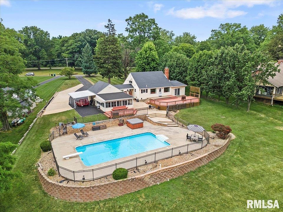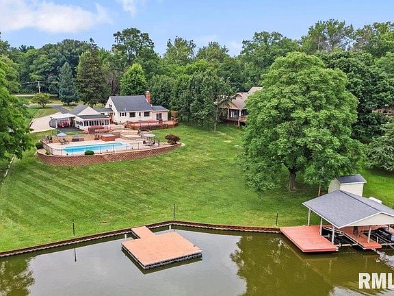 This incredible lake home retreat offers over 2,200 finished square feet of charm & functionality across three fabulous levels. Find it nestled on a 1.16-acre lot with 177' of shoreline in a peaceful & scenic bay, this gem is designed for everyday living & unforgettable entertaining. Find a large sunroom attached to the garage which makes excellent use as a pool house & offers stunning views of the inground pool, hot tub & multi-tiered deck & patio spaces with an incredibly quiet & private lakeside backdrop. You'll love the beautifully manicured landscapes featuring stone retaining wall accents that add striking appeal as you approach from the lake. Inside, enjoy the vaulted living room with deck access and an elegant double-sided fireplace shared with the dining area. Modern stainless appliances & ample, quality cabinetry can be found in a kitchen that flows effortlessly through the heart of the home. 2 bedrooms & a full bath round out a smart, functional layout where the upper level is the master suite (with half bath) while the bsmt features tons of finished space & a full bath showcasing endless options for recreation, entertaining & relaxation. Practical perks like the tankless water heater, mini split A/C's + other thoughtful maintenance items are paired with peaceful bay views that make this spot & opportunity a rare find on Lake Springfield & total must-see.
