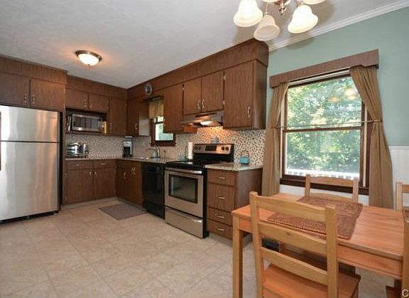 Open floor plan for living room with hardwood floor and bay window and kitchen with granite counters, tile backsplash and stainless appliances. Huge open lower level family room with walk out and wet bar, 683 sq ft. Newer roof, two car attached, gas heat and central air! Easy access to commuting.