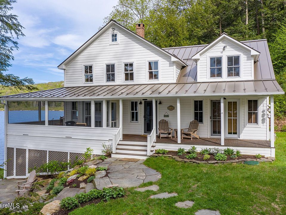 Possibly the best waterfront location on Lake Garfield, this 1935 cottage was completely renovated, added to and winterized in 1997/98, with further recent renovations including a new metal roof and HVAC. A quintessential lake house with fresh and modern amenities, fixtures and appliances. Although one would want to spend all their time on the wraparound porches and decks, the bright interior offers a living room with a stone fireplace, a first floor primary suite, three second floor guest bedrooms and a large overflow family room, all with water views. Hardscape, including stone retaining walls, patio and fire pit lead to a long dock. There's a beach for pulling up kayaks and jet skis, with easy swimming off the dock. Offered mostly furnished. Water water everywhere!