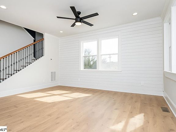 Welcome home! With a prime location in West Greenville, close to Flour Field, Falls Park, Unity Park and the medical facilities at Prisma Health and St. Francis. Nestled on a quiet street with abundant charm, this home welcomes you with a full-length rocking chair front porch. Enter to a tastefully designed interior where the living room sets the tone with a painted accent wall, superb lighting choices, luxury flooring and crown molding that gracefully flows throughout the entire home. The signature kitchen is a showstopper, featuring a quartz center island, extended height/soft-close cabinetry with a built-in pantry, a subway tile backsplash, and stainless steel appliances with a range pot-filler. Adjacent is a spacious eat in kitchen area with a wicker globe chandelier, creating the perfect setting for meals. On the main level, discover a convenient half bath with tile floors, a quartz vanity and a framed mirror, as well as a dedicated laundry room with ceramic tile. All bedrooms are located upstairs. The owner's bedroom is a delightful retreat with its accent wall, recessed and ceiling fan lighting and bedside reading globes. A stylish sliding barn door reveals the exceptional bath with designer tile floors, a dual sink quartz vanity with a full wall tile backsplash and a roomy tiled shower with an overhead rain faucet. Both secondary bedrooms offer ample space and deep closets, sharing the central half bath with tile, a dual sink quartz vanity and framed mirrors. The fenced in backyard boasts a spacious deck and freshly sodded grass.