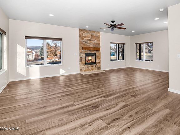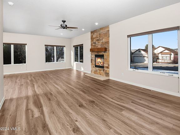 On the main floor, you'll find an open concept living area with a large, inviting living room, dining space, and kitchen, all perfect for entertaining or everyday living. A half bath and a mud/laundry room provide added functionality and ease. The cozy gas fireplace with a new dry-stack surround creates a warm focal point in the living area, while the freshly painted walls and stunning new LVT flooring tie everything together beautifully.