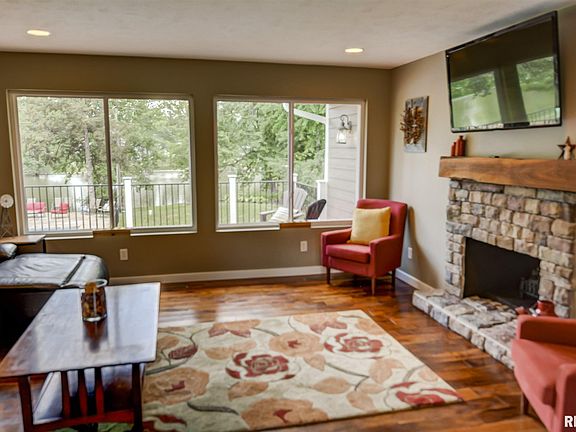 Beautiful , totally remodeled inside and out. Like new! Ranch with walk out lower level with 5' window in lower level. Finish of lower level is just as nice as the upstairs. High quality finishes throughout. Master suite with huge bathroom and walk in closet. Large great room with kitchen, dining and living room all facing the water. Rear upper level deck facing the water. Lower level has real tile floors that look like wood, wood burning fireplace with stone exterior. 5' windows in lower level on all rooms facing water. Walk out to stamped concrete patio and 1 year old in ground pool. concrete walk way to new dock on lake. Amenities will WOW you. Panoramic view out back of the Lake with a Gentle slope to the Bertinetti Nicely landscaped. MUST SEE!