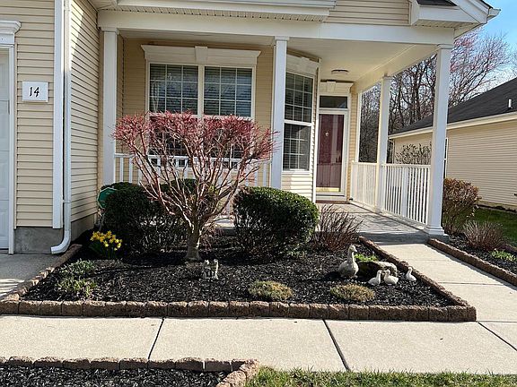 Welcome to 14 Brighton Place, located in the desirable 55+ community of Four Seasons at Weatherby! This well-maintained, move-in ready Inverness model is situated on a desirable private lot with a wooded view in the back. Walk up to the front porch with stamped concrete design, which offers space for a table, chairs and potted plants. Enter the front door into the foyer and step onto the oak hardwood flooring. You'll find the third bedroom to your left which offers ample sunlight and could be used as an office. Continuing to your left down the custom painted hallway, with crown molding, you'll find a nook which is perfect for a hutch for extra storage. Across is the laundry room which offers a washer and newer dryer (2023), as well as cabinet storage, a utility sink and hot water heater. Down the hallway, you'll see the guest bathroom, coat and linen closets, and spacious second bedroom. You'll also find the door to the 2 car garage, in addition to the panel for your home security system. The garage offers a cubby area for your tools, plenty of space for shelving on the side, as well as a staircase to access the attic and HVAC. In your new home, you'll have the ability to walk up stairs to access your HVAC (replaced in 2016) to change your filter with ease. In addition to the separate HVAC access, you'll find an enclosed attic space with a window overlooking the driveway. This attic space is heated and has A/C (also replaced in 2016) for your personal needs. Continuing from the foyer, walk straight ahead to the living room, noting the continued custom paint, crown molding and drapes throughout the living and dining room. On the left of the dining room, you'll find a linen closet and doorway to the master suite. Entering the master suite, you'll see the master bath to your left which includes a walk-in shower with a seat, jacuzzi tub for relaxing, and double sink. As you enter the large master bedroom, note the two walk-in closets with shelving for plenty of storage space, as well as the bay window addition in the bedroom. The master bedroom bay window offers a nice view of your private backyard. Continuing from the living room/dining room area, enter into the kitchen which offers a new stainless steel built-in microwave, electric stove and dishwasher, as well as the stainless steel fridge (replaced in 2012). The kitchen boasts plenty of cabinet space, a breakfast bar, and pantry. There is also an eat-in area with a bay window showcasing plantation shutters, which provides ample space for a table and chairs. Walk into the family room with sunroom addition. The family room offers a gas fireplace, creating a warm and inviting atmosphere. There is also a ceiling fan to help keep you cool on summer days. The vaulted ceiling and windows of the sunroom offer depth and light to this space, great for relaxing and birdwatching! Step out the back door and storm door, with built in screen, onto the custom built paver patio that allows space for a grill, table and chairs for lounging or entertaining. The patio is shielded by arborvitaes on one side, and enclosed by a sitting wall with lighting. The walls are connected by a gate which can be removed if desired. Landscaping around the house includes many lily varieties, a rose bush, butterfly bush, daisies and azaleas which you can enjoy this spring! Some additional recent upgrades include newer gutters and fascia in 2024, a newer front storm door in 2024, and A/C replaced in 2016. The clubhouse offers many classes such as yoga and tai chi, as well as many activities and amenities. Close to 295, shopping, medical facilities, and restaurants. Make this beautiful home yours and enjoy all Four Seasons has to offer!