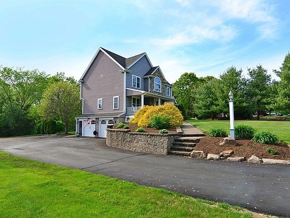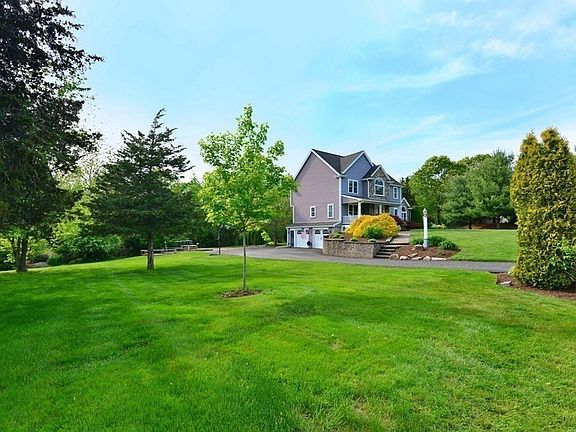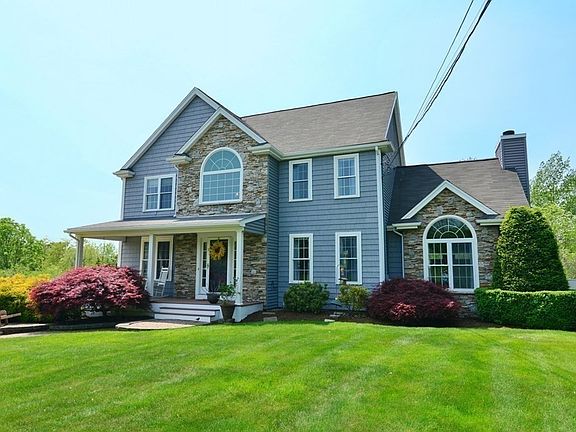 In a quiet double cul-de-sac neighborhood, this picturesque Colonial sits on a beautifully landscaped lot. A detailed stone walkway leads to the front porch. Enter an open foyer flanked by a living room w/french doors and dining room enhanced w/crown molding and wainscoting. The spacious kitchen boasts custom cabinetry, granite counters, double wall ovens and many built-ins. A sun soaked 3 season room abuts the kitchen. The open family room has cathedral ceilings and a gas fireplace. A half bath and office/pantry finish the main floor. Upstairs is the primary suite w/vaulted ceilings, a walk-in closet and stunning updated bath w/steam shower. Two ample bedrooms and a full bath w/laundry complete this level. The home has a 4-bed septic and plenty of flex space to accommodate a 4th bedroom. The finished basement offers storage, a half bath and slider opening to a covered patio, pergola, shed, and fire pit.  Welcome Home!