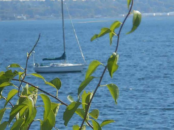 Touisset Waterfront. Open porch faces the bay, with unobstructed views of the water, boats and seabirds. The lawn slopes down to the beach. White picket fence frames this charming gambrel with an open floor plan. Fireplace. 2 car garage.