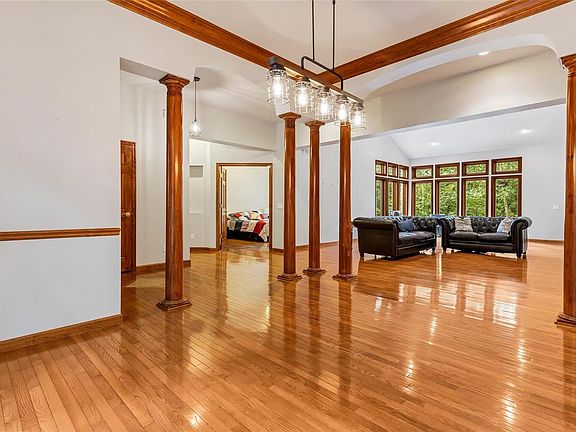 Private lake living. Open & sunny brick atrium ranch home with 3871 SF of living space in sought after Callaway Valley. Tucked away, steps from the private lake gate on a corner 3.2 wooded acre lot. 4BR, 3.5BA. Soaring ceilings accentuate the endless windows, abundance of natural light, overlooking woods. Luxury Master Suite has HIS & HER professionally designed closets & coffered ceiling. Owner's Suite's bath has Jacuzzi tub & walk-in shower, double vanities. Functional kitchen includes, cooktop, built-in oven/microwave, granite countertops, walk-in pantry & custom 42" cabinetry. Private 160 acre lake-sandy beach, swim area, covered pavilion, grills & Marina! Builder finished lower level. Extras: oversized 3 car garage, tall pour in w/o basement, 2 fireplaces, Pella windows, screened porch, deck & patio. Zoned HVAC & Geothermal climate control system. Public water. Central Vacuum. LIVE WORK PLAY in the comfort of this lake community right at home. Property being sold as is.