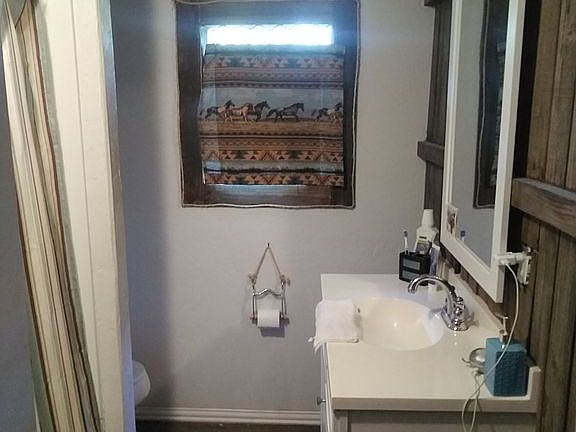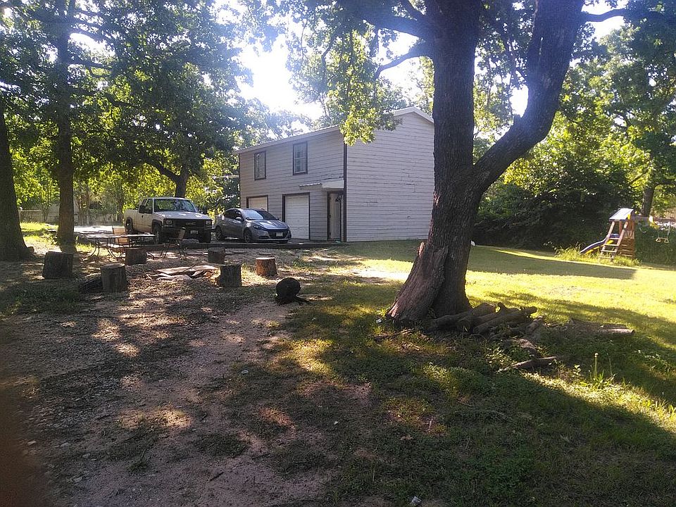 On almost an acre, outside city limits, 3 yr old central heat and air unit, 3 yr old tin roof, 2 bay garage downstairs, 2 bed 1 bath upstairs