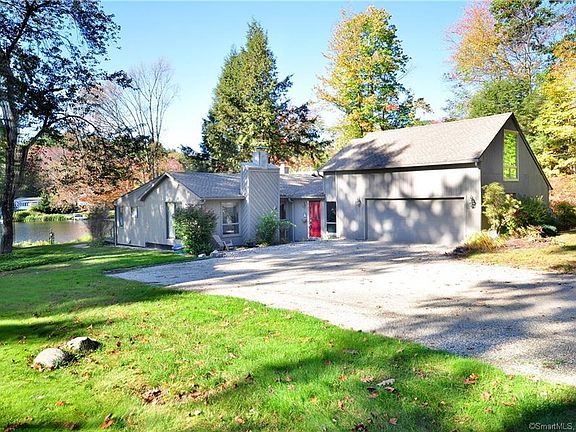 100 feet of waterfront with dock on beautiful Harwinton Lake makes this property a true oasis This lovely, 4 bedroom and 2 full bathroom ranch is a very special place to call home. Open floor plan flows perfectly from large great room with gas fireplace, ceiling fan and hardwood floors to updated kitchen lined with glass sliding doors that offer unobstructed views of the lake. Entertaining is a breeze with large kitchen island, large pantry and cozy brick wood-burning fireplace. Master suite and additional 2 bedrooms are on main level. The 4th bedroom, just off of the foyer and above garage, makes a great private guest room, office or bonus room. Lots of room in the garage with over-sized work bench for those weekend projects. Some of the many upgrades include: patios, newer roof, new oil tank, and new hot water tank. Annual HOA fee is $130. Only electric motors allowed on lake. Generator and pontoon boat, while not included, are negotiable. Gas logs in great room fireplace are not hooked up to gas lines.