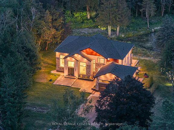 Welcome to this extraordinary custom-built estate nestled on a breathtaking 4-acres lot in one of Caledon's most sought-after neighborhoods. This property seamlessly combines luxury, comfort, and natural beauty-complete with a pond, wrap-around deck, and a massive driveway offering unmatched curb appeal. Inside you'll find high-end finishes throughout, including a chef's dream kitchen with premium built-in appliances, pot lights, and an integrated multi-zone speaker system for an elevated living experience. The expansive open-concept main floor boasts a soaring 18-foor ceiling in the living room, creating a grand and airy atmosphere ideal for entertaining or family gatherings. This stunning home features four spacious bedrooms-3 on the upper level, one on the main floor, and 1 in the walkout basement-along with four full bedrooms and a convenient powder room. The walkout basement offers limitless potential to customize as a home theatre, gym, or in-law suite. Perfectly located just minutes from Highway access and surrounded by serene natural landscapes, this estate offers the ideal balance of privacy and convenience. Experience refined country living without sacrificing proximity to all major amenities.
